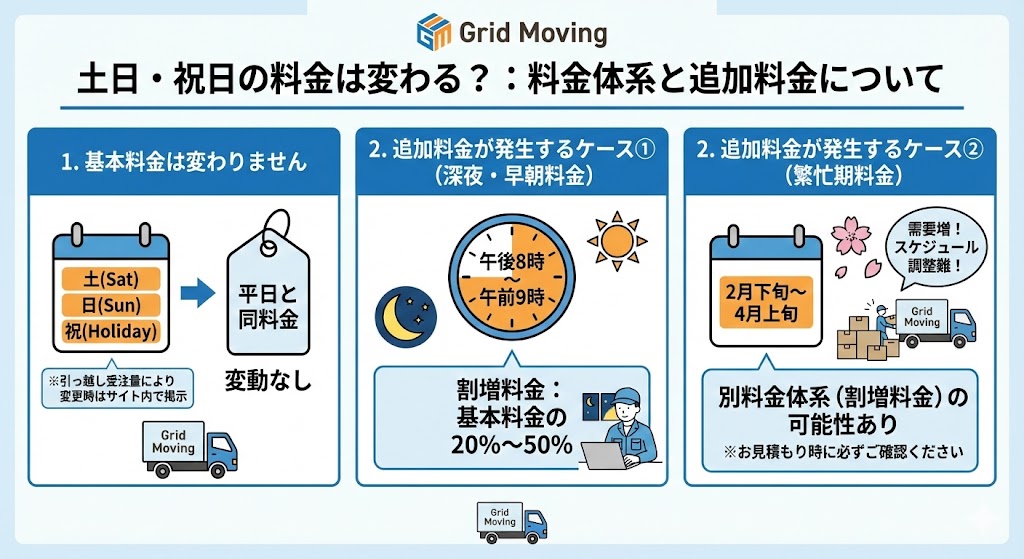 2025/11/19引っ越しサービスに関する疑問土日・祝日の料金は変わる?土日・祝日の料金体系と追加料金が発生する時間帯について1. 基本料金は変わりませんGrid Movingでは、お客様がご利用しやすいように、土曜日、日曜日、祝日であっても平日の基本料金から変動はござい...